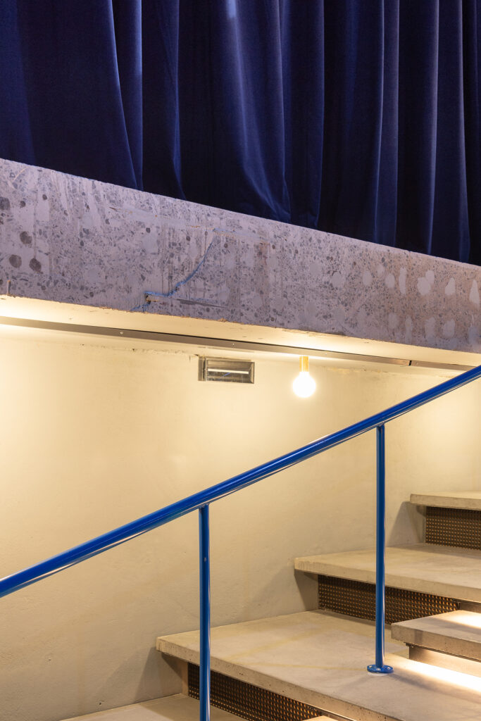 Instead of developing a brand-new building identity that stands out of the city fabric, we chose to work with the original material of the 70s city: bricks. The façades of the simple volume are designed as a contemporary dialogue between existing and new brick patterns. Like a palimpsest, the different layers added over time show and reinforce the story of the city and the theatre. A carefully placed window opening to the street reveals the underground level and shows passers-by a hidden part of the city. Not only cars to hide, but also culture to show.