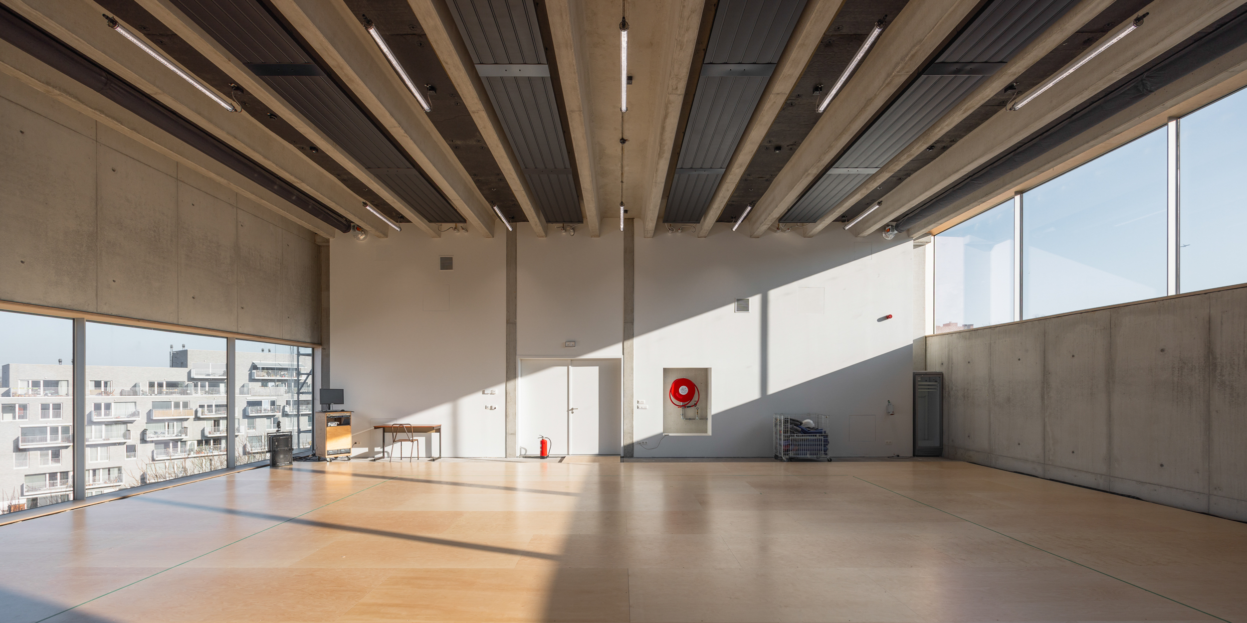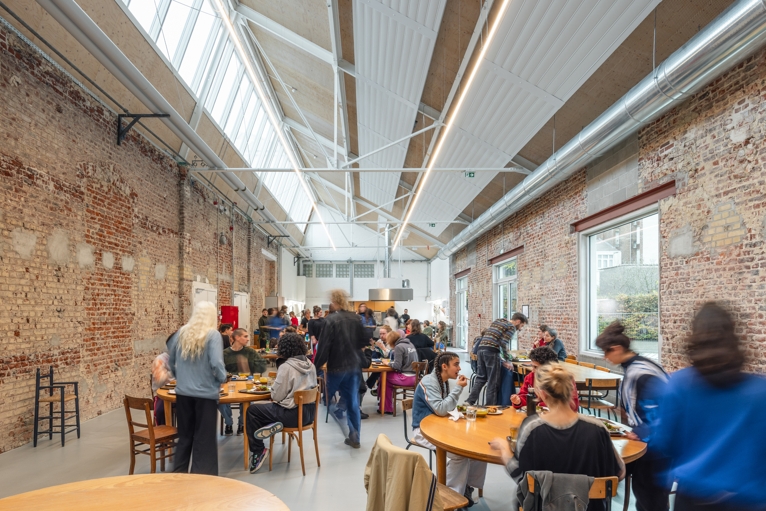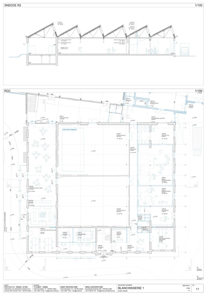 A former industrial site in Brussels (originally dedicated to laundry), converted for more than twenty years into a campus for internationally acclaimed dance school P.A.R.T.S., dance company Rosas and contemporary music ensemble Ictus. Several projects and buildings added along the years to the historical laundry. New programs/buildings for more dance studios, integrated into a new general masterplan/reorganization for the whole site and its landscape.